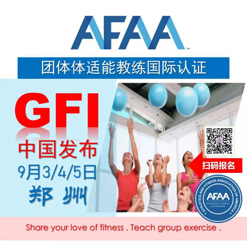 恒盛娱乐国际健身教育(美国AFAA授权中国合作伙伴)贯行与AFAA美国最新课程同步之原则,在2019年推出最新 AFAAGFI中文版(AFAA团体训练国际认证)。目前课程中文版资料正在准备中。AFAA GFI中文版(AFAA团体训练国际认证)现场研习会包括3天现场课程+线上中文笔试(登录www.nasm.org进行)。
