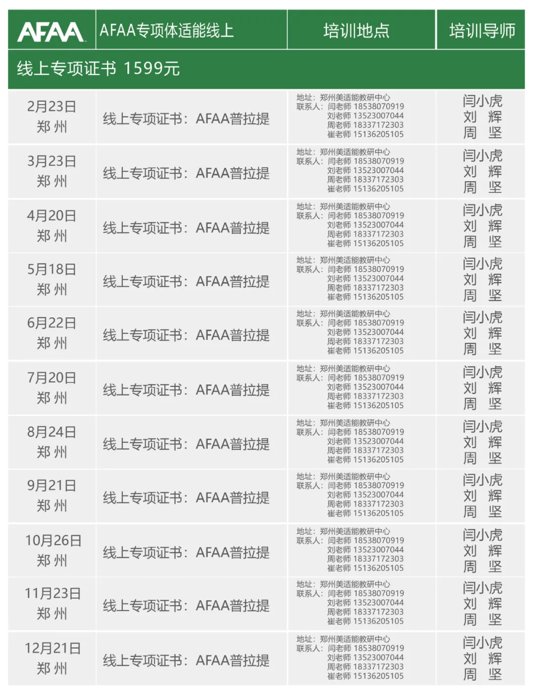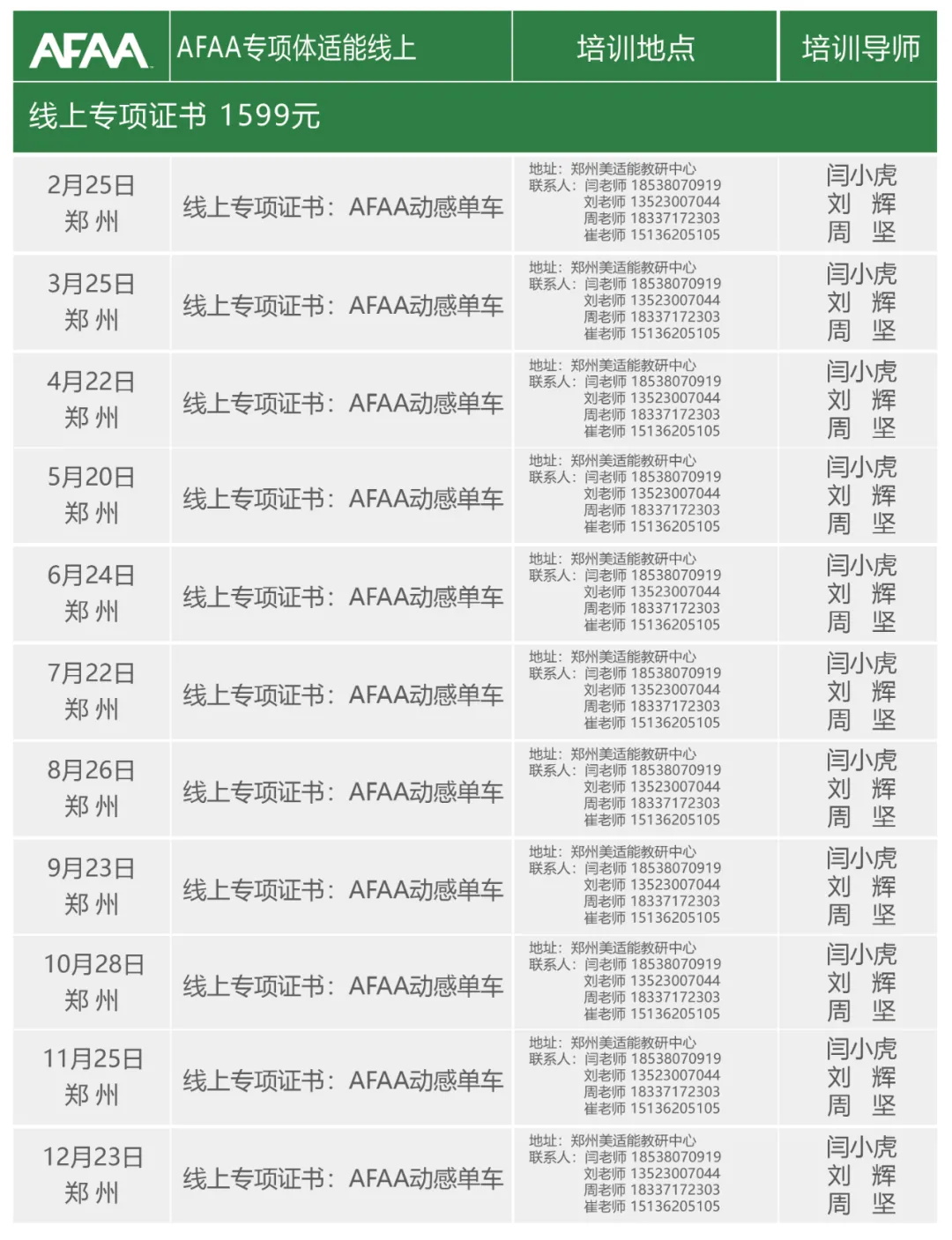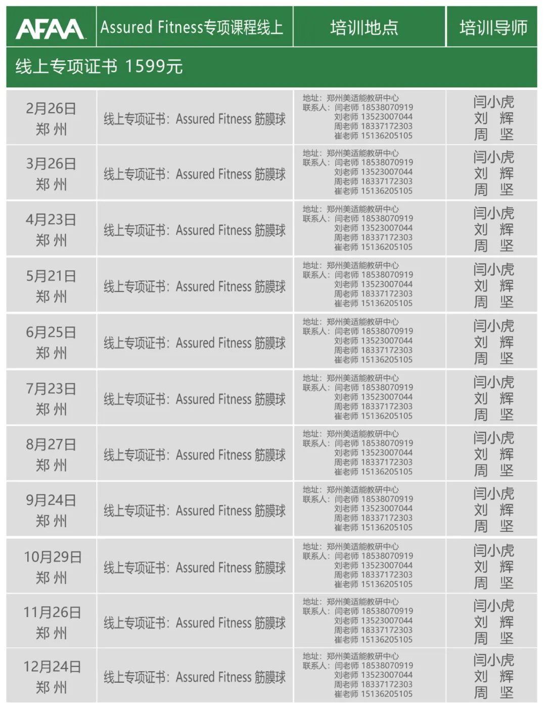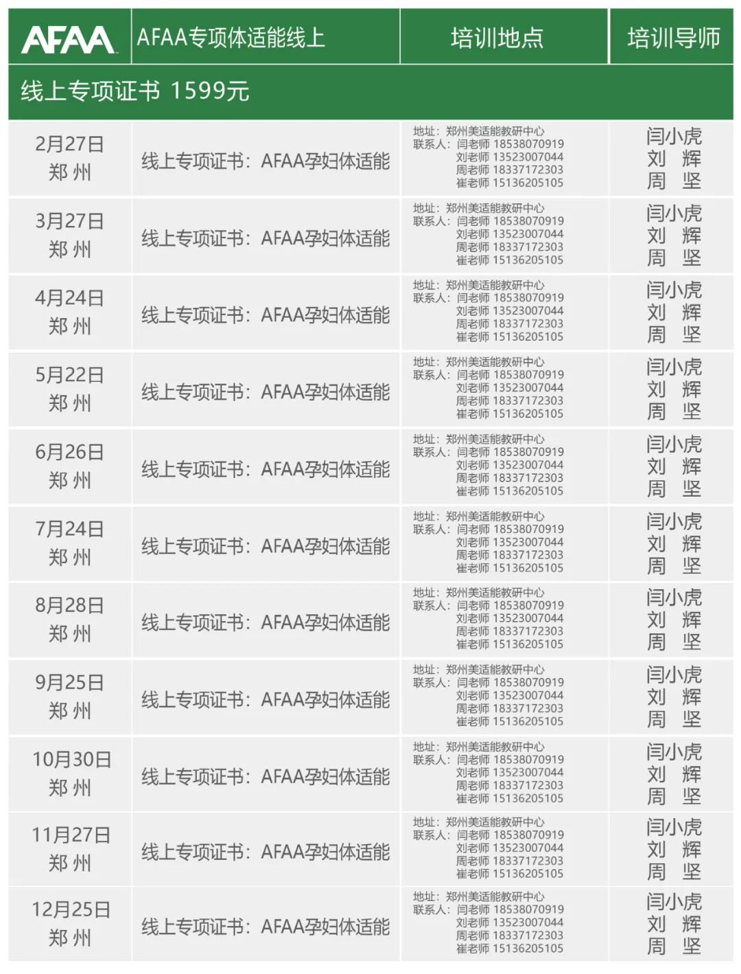 课程介绍:培训课程重点介绍AFAA孕妇体适能标准及指导纲要。具体包括:胎儿成长和发育、生产和产科并发症、怀孕生理学、荷尔蒙改变、心肺功能变化、新陈代谢和内分泌方面的因素、营养需要和风险因素,相关的并发症、危险症状,风险因素,相对于绝对禁忌,以及预警迹象和症状。此课程使体适能教练获得专业性知识和技巧来对孕妇这一群体做出更加合理安全的课程设计,指导孕妇产前、产中体适能计划,以及产后恢复。