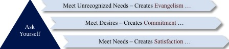 如图1-1所示,满足需求只能建立满意度,60-80%在调查中得到 "满意 "或 "非常满意 "的客户仍然有可能从你的产品或服务中叛逃(5,6)。为什么呢--因为他们对你没有建立忠诚度。然而,如果你能做的不仅仅是满足他们的需求,也许还能满足他们的欲望,那么你就会开始创造更多的承诺,从而带来忠诚度。最终,如果你能解决未被满足或未被认可的需求,你就能创造出一种布道式的反应,你的客户会积极推广你的业务(即你的品牌大使或布道者)。