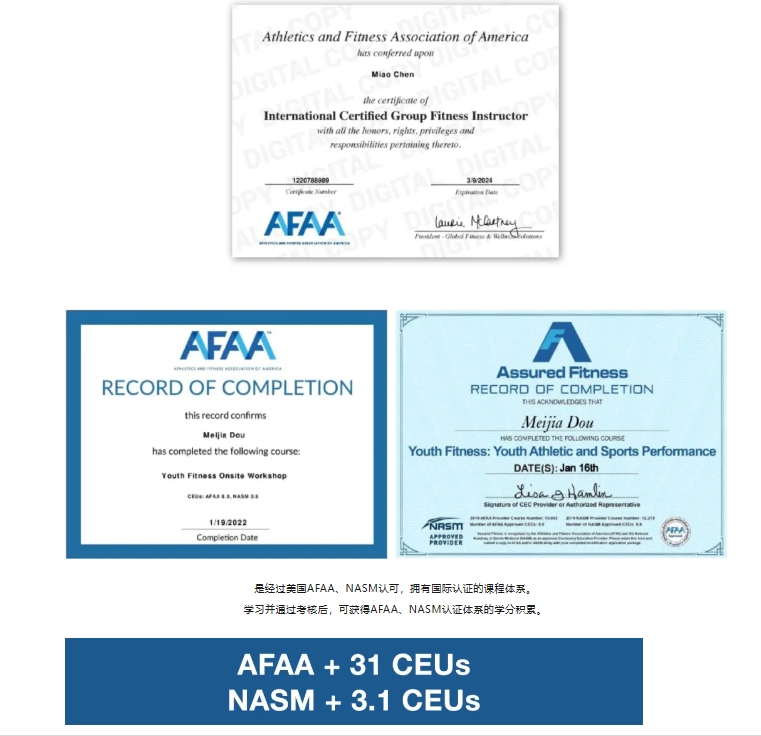 获取证书:AFAA GFI国际团体体适能证书 & AFAA少儿体适能国际专业教练证书 & AF青少年竞技体能训练师