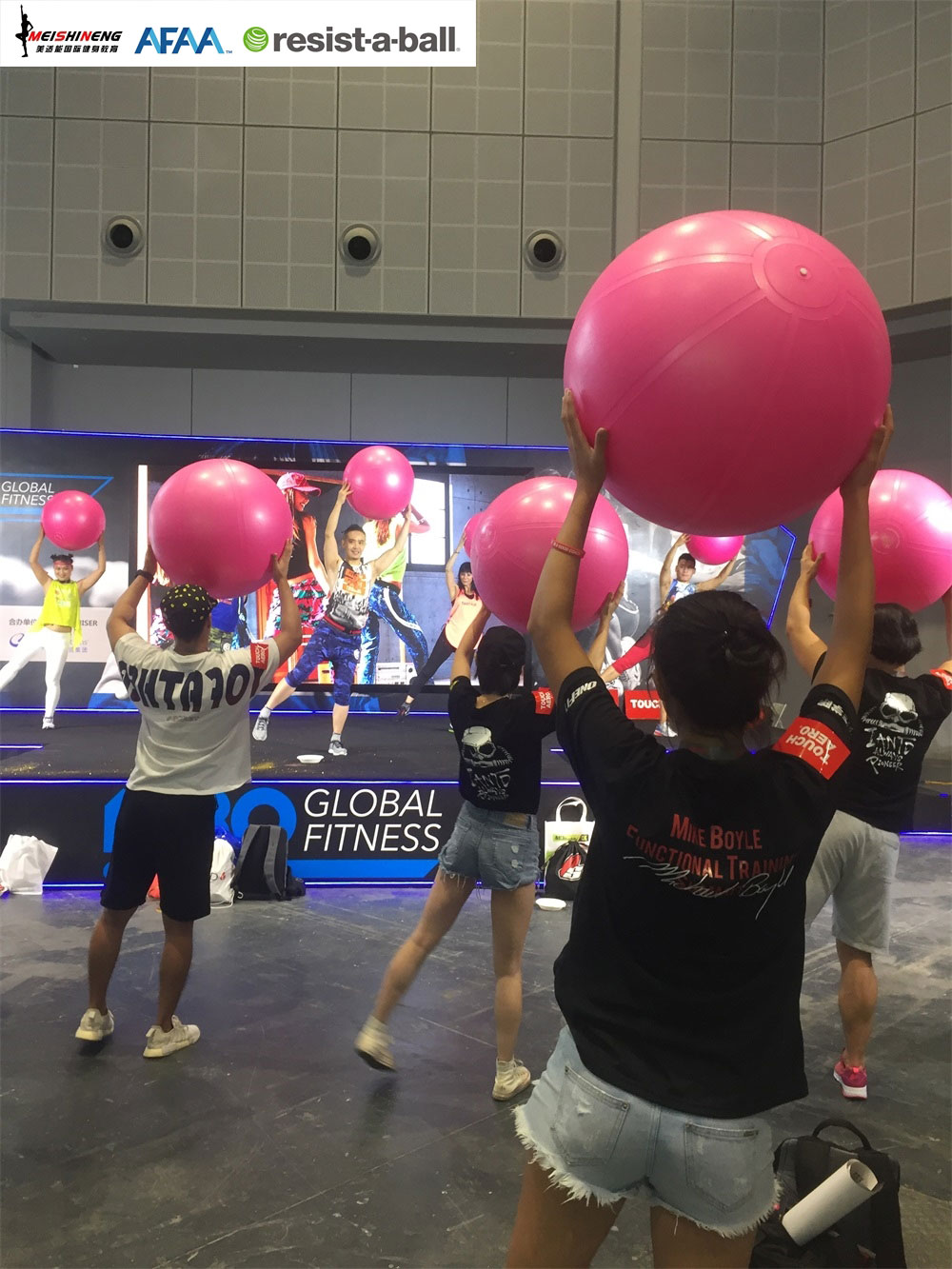 LISA老师带领恒盛娱乐AFAA导师团队闫小虎老师,刘辉老师,周坚老师,崔婷歌老师为大家奉献一场RAB国际抗阻力球的激情训练。