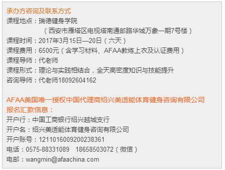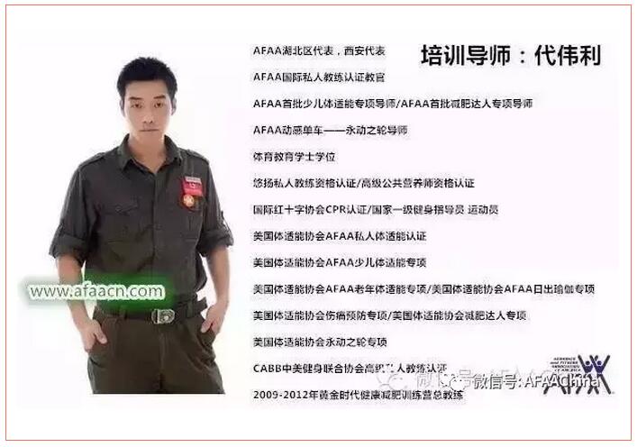 AFAA是“美国体育及体适能协会”( "Athletics and Fitness Association of America")的简称。简称。30多年来 AFAA 每年在美国境内的俱乐部与有氧教室举办超过35000场具教育意义的研讨会,并发展成为"世界最大体适能教育机构"及网络远程体适能(TeleFitness®)教育机 构。截至目前为止,在全球已有超过35万人取得 AFAA 核发之国际认证,并活跃于全世界80余个 国家体适能业界。AFAA 致力于为热爱体适能和体育事业的专业人士提供认证教育。AFAA 坚信改 变形体,可以让生活变得更美好。其专业队伍涵盖私教和团体体适能两个领域。AFAA 教练不仅 知道如何锻炼,还掌握实践技巧,科学理论和动手能力,以期有效激励和激发大家进行更加健 康快乐生活。 AFAA 是具有公信力且可信赖的教育机构,所有的检定考试及教育课程皆受相关单位认可。 AFAA 由远程教育及培训委员会(DETC)认可。DETC 为美国教育部所列权威认证机构。AFAA 也 获得高级教育认可委员会(CHEA)承认。AFAA 的认证考试由生命研究会(Vital Research)授 权。AFAA 是美国健身考试委员会(NBFE)及美国国家资格保证协会(NOCA)的联盟组织。 并满足IHRSA2005年提出的国际体适能教育认证机构建议指标。 作为全球体适能认证界的领军品牌,AFAA 创立并实践《安全体适能之基础运动 标准和指导纲要》