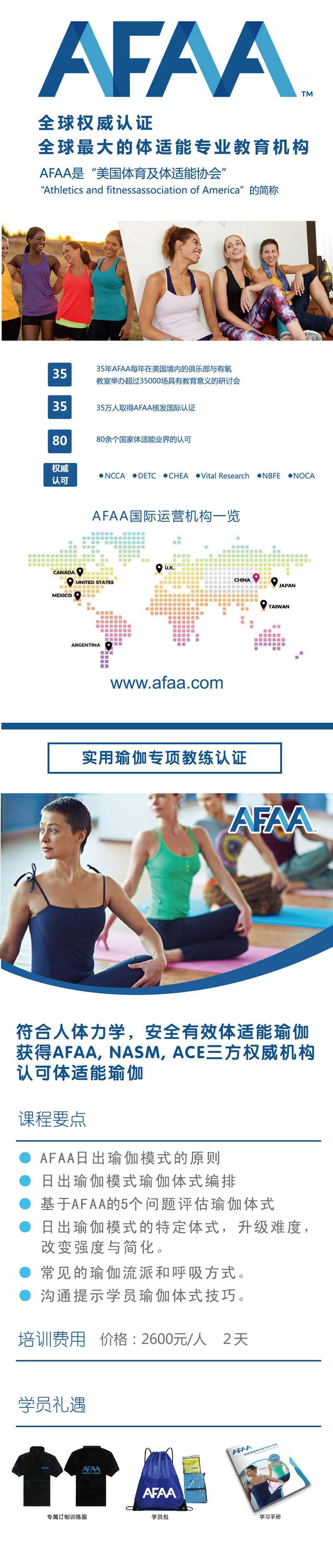 AFAA是“美国体育及体适能协会”( "Athletics and Fitness Association of America")的简称。简称。30多年来 AFAA 每年在美国境内的俱乐部与有氧教室举办超过35000场具教育意义的研讨会,并发展成为"世界最大体适能教育机构"及网络远程体适能(TeleFitness®)教育机 构。截至目前为止,在全球已有超过35万人取得 AFAA 核发之国际认证,并活跃于全世界80余个 国家体适能业界。AFAA 致力于为热爱体适能和体育事业的专业人士提供认证教育。AFAA 坚信改 变形体,可以让生活变得更美好。其专业队伍涵盖私教和团体体适能两个领域。AFAA 教练不仅 知道如何锻炼,还掌握实践技巧,科学理论和动手能力,以期有效激励和激发大家进行更加健 康快乐生活。