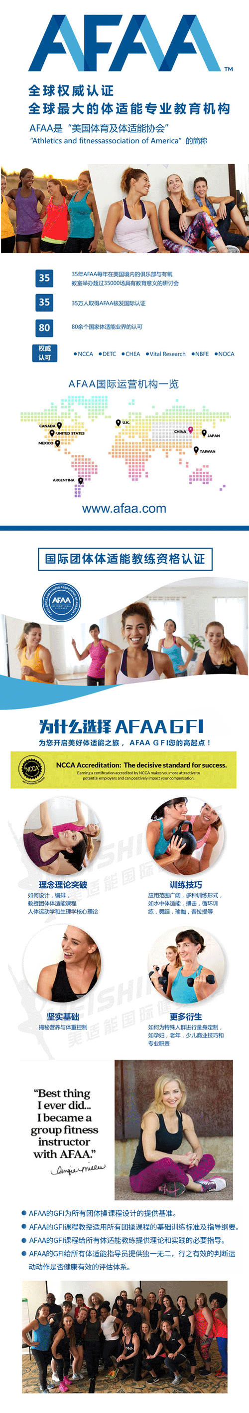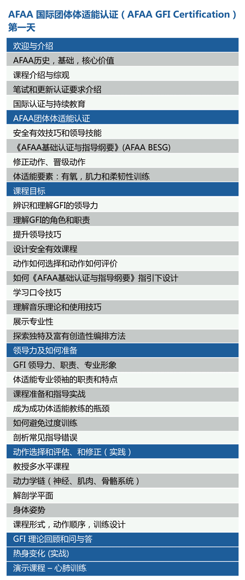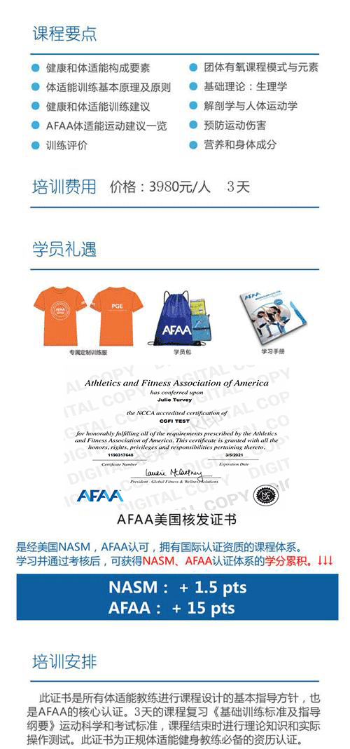 作为全球体适能认证界的领军品牌,AFAA 创立并实践《安全体适能之基础运动 标准和指导纲要》